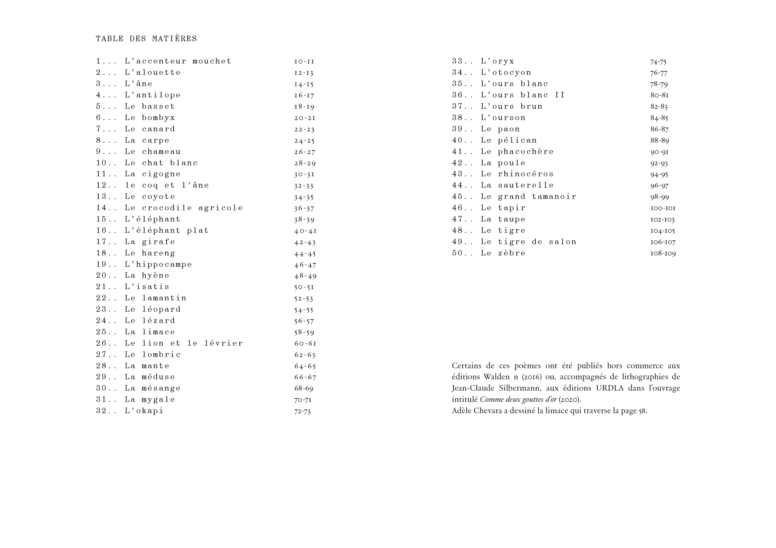 La poésie animalière, notamment fabuliste, s'est longtemps employée à dresser d'aimables portraits de « nos amies les bêtes ». Il fallait poursuivre sans préjugés l'examen de ce règne plus que voisin du nôtre. C'est à quoi s'attellent ces Fabules qui fourmillent de révélations sur une cinquantaine d'animaux familiers, souvent méconnus et parfois justement mal-aimés. La logique de leur monde a trop été négligée. Les poèmes et collages de cet ouvrage remédient à cette lacune.