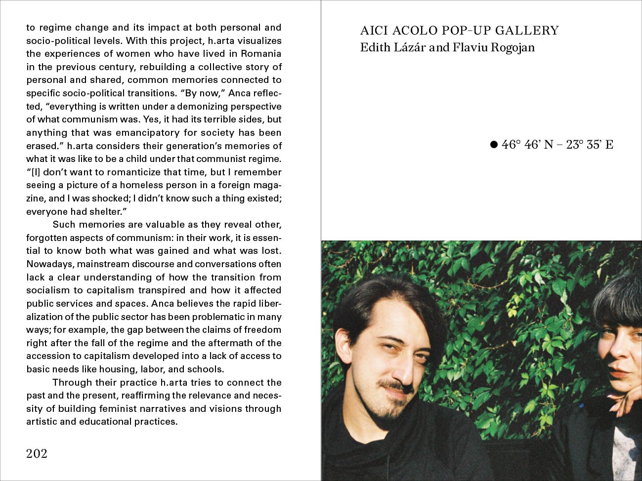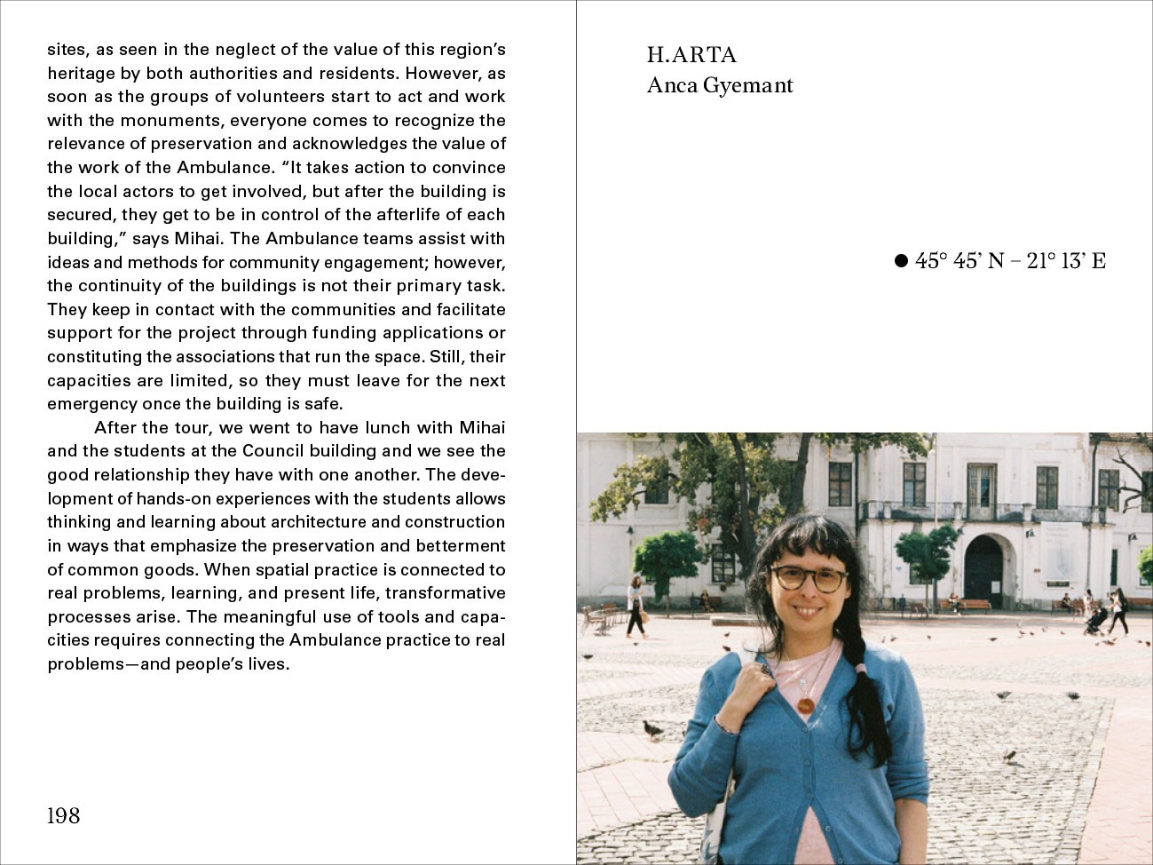 Avec Alex Axinte (OPEN Garage), Alexandra Trofin (BETA Biennial), Raluca Voinea (The Experimental Research Station on Art and Life), Silvia Moldovan (SEPALE Cultural and Ecological Association), Daria Maria Oancea & George Marinescu (Atelier Ad Hoc Arhitectura), Matei David (Cișmigiu Civic Initiative Group), Loredana Pană (Ecopolis), Silviu Medeșan (Someș Delivery), Marta Popescu (MaiMultVerde), Răzvan Crimschi, Maria Luiza Zamora (Asociația 37), Mihai Danciu (Jiu Valley Engaged Coalition), Mihai Moldovan (Ambulance for Monuments), Anca Gyemant (h.arta), Edith Lázár & Flaviu Rogojan (Aici Acolo Pop-Up Gallery), Tobias Pasăre (Casa Verde).