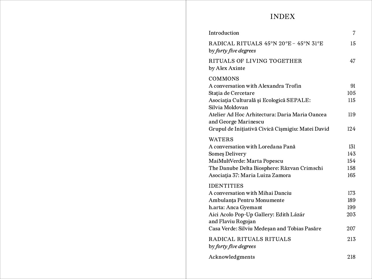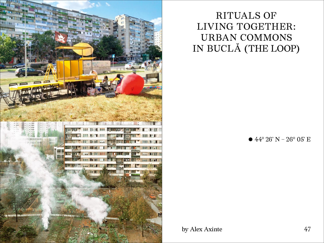 Des pratiques spatiales plus justes sont à chercher dans la diversité et les nuances d'une myriade de paradigmes de création d'espaces qui s'attaquent aux défis locaux tout en apportant des réponses crédibles aux problèmes mondiaux actuels. Radical Rituals recueille des protocoles spatiaux suivant une ligne imaginaire : le parallèle 45°N. Cette ligne traverse l'Europe, de la côte atlantique à la mer Noire. Les pratiques sont appelées rituels car elles renforcent le potentiel d'action collective afin d'aboutir à un changement systémique. Elles sont qualifiées de radicales parce qu'elles sont hautement transformatrices et indiquent des futurs possibles.