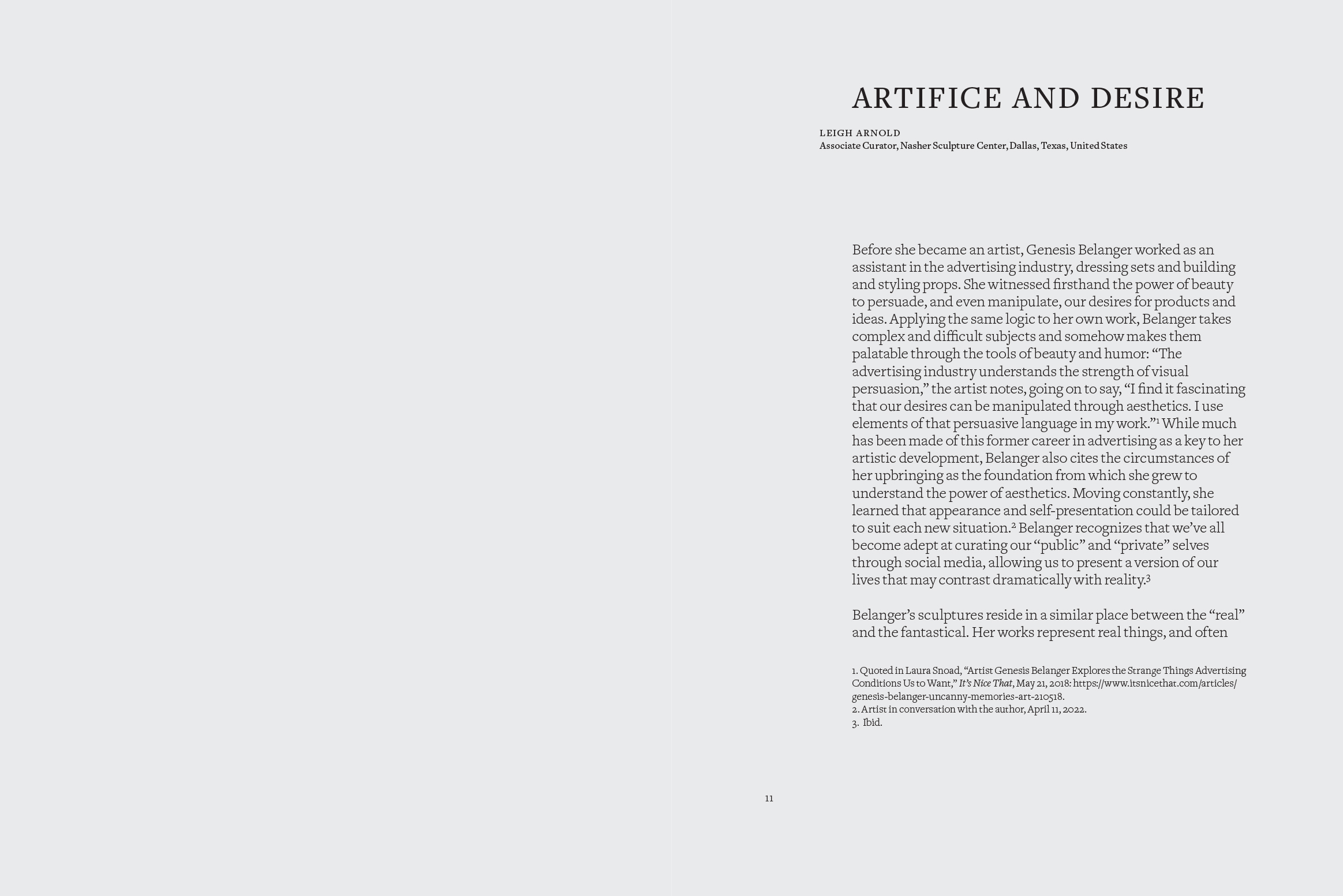 L'ouvrage débute par une introduction de la curatrice Amy Smith-Stuart, qui présente les travaux de Genesis Belanger, et la façon dont elle explore la question du genre. Un deuxième texte, écrit par la curator Leigh Arnold, explore la façon dont l'artiste, influencée par son expérience de la publicité, utilise la beauté et le désir afin d'entamer un dialogue avec le spectateur. Un troisième essai est signé par Éric Troncy, co-directeur du Consortium à Dijon.