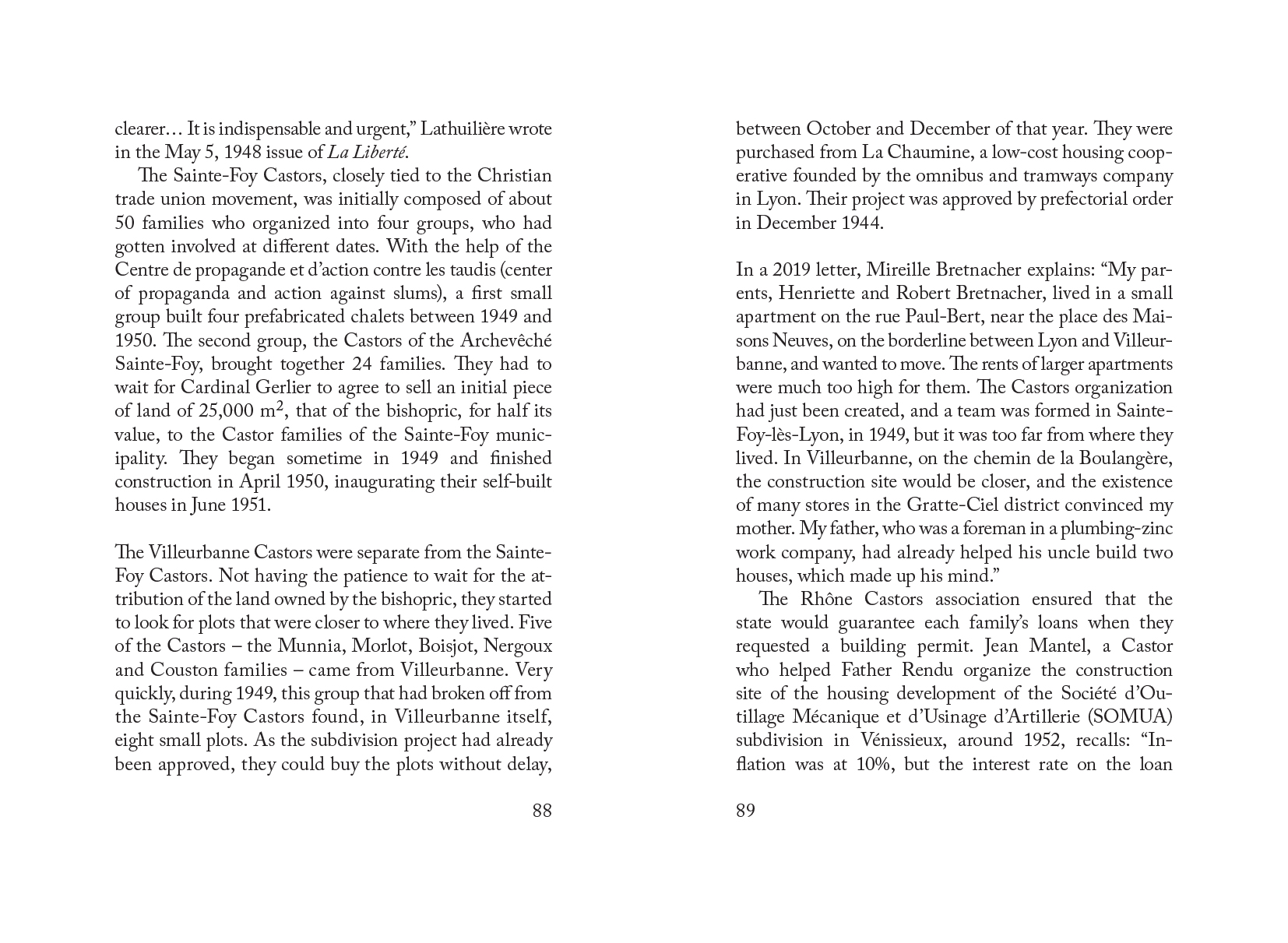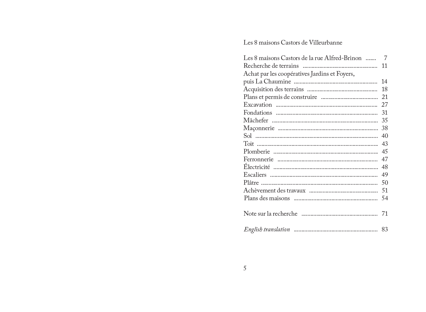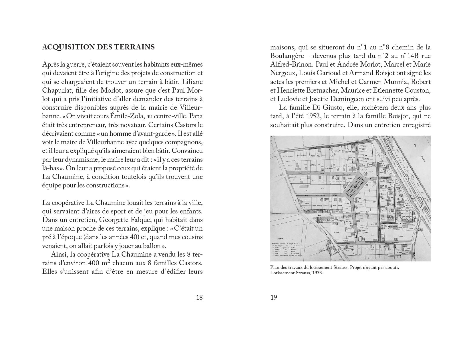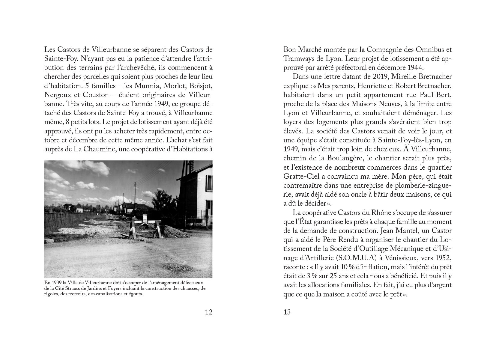 Les 8 maisons Castors de Villeurbanne est un récit de la folle aventure où 8 familles de Castors ont construit 8 maisons, en mettant en commun leurs différentes connaissances : si l'un était électricien, l'autre était plombier, l'autre maçon, serrurier, chaudronnier ou dessinateur.