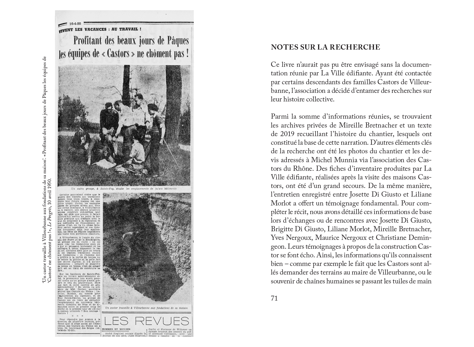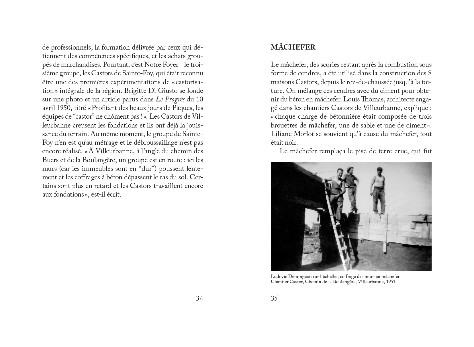 Initié à la suite d'une enquête sur les transformations urbaines à Villeurbanne, en collaboration avec les habitants de Castor, ce livre-récit est une expérience à la croisée de l'art, de la construction et de l'urbanisme. Le livre-récit est une vision aiguë du processus de construction et de la façon dont le matériau s'inscrit dans la ville construite. En explorant la relation avec la terre et les matériaux, une grande attention est accordée à la manière dont les matériaux de construction ont été récupérés à partir des sédiments de la rivière proche – les familles creusant profondément pour obtenir du gravier et du sable. Les cendres ont été obtenues à partir des industries voisines pour fabriquer du béton mâchefer.