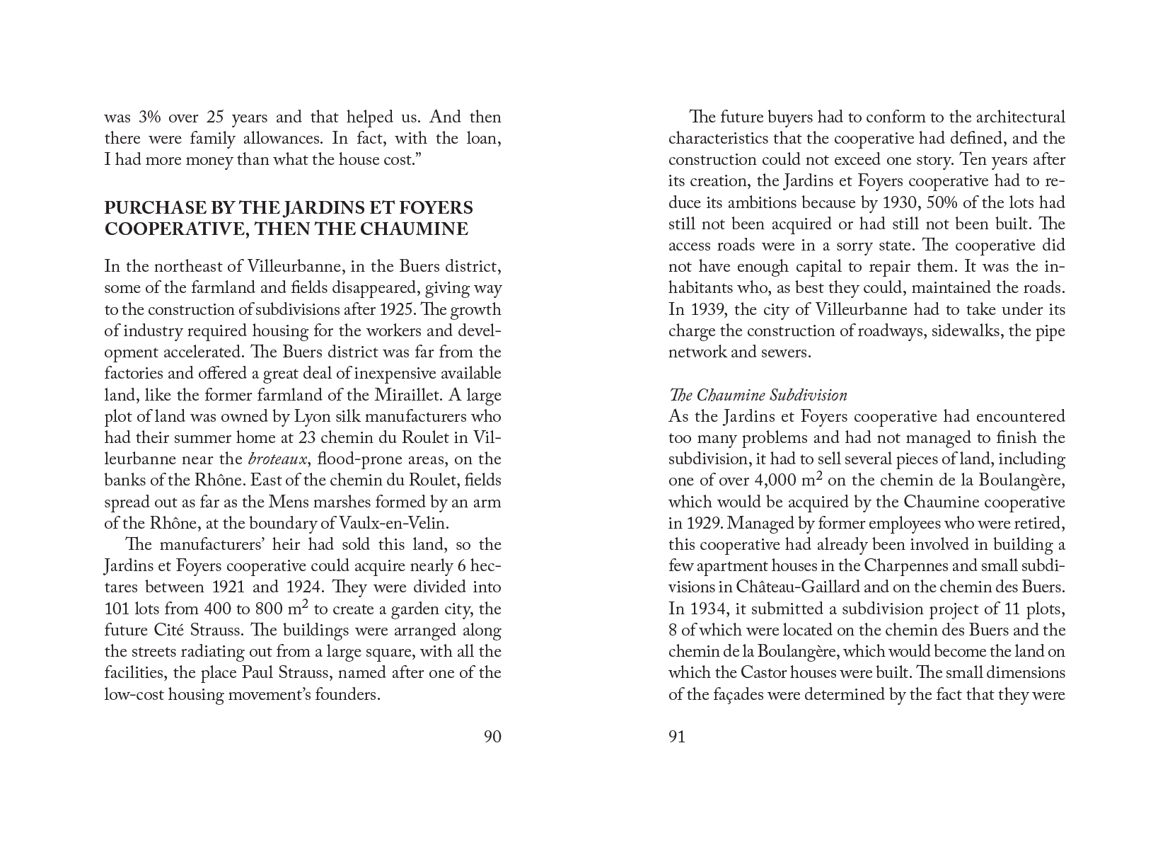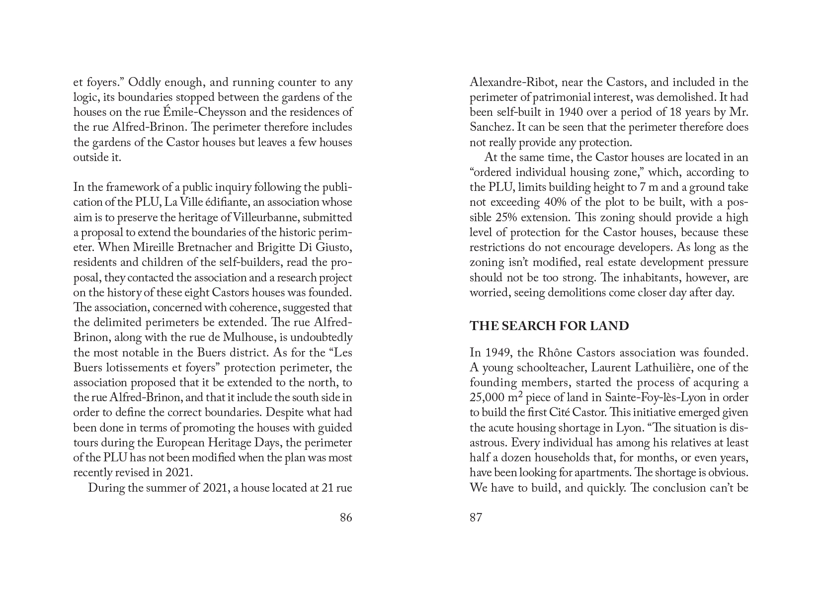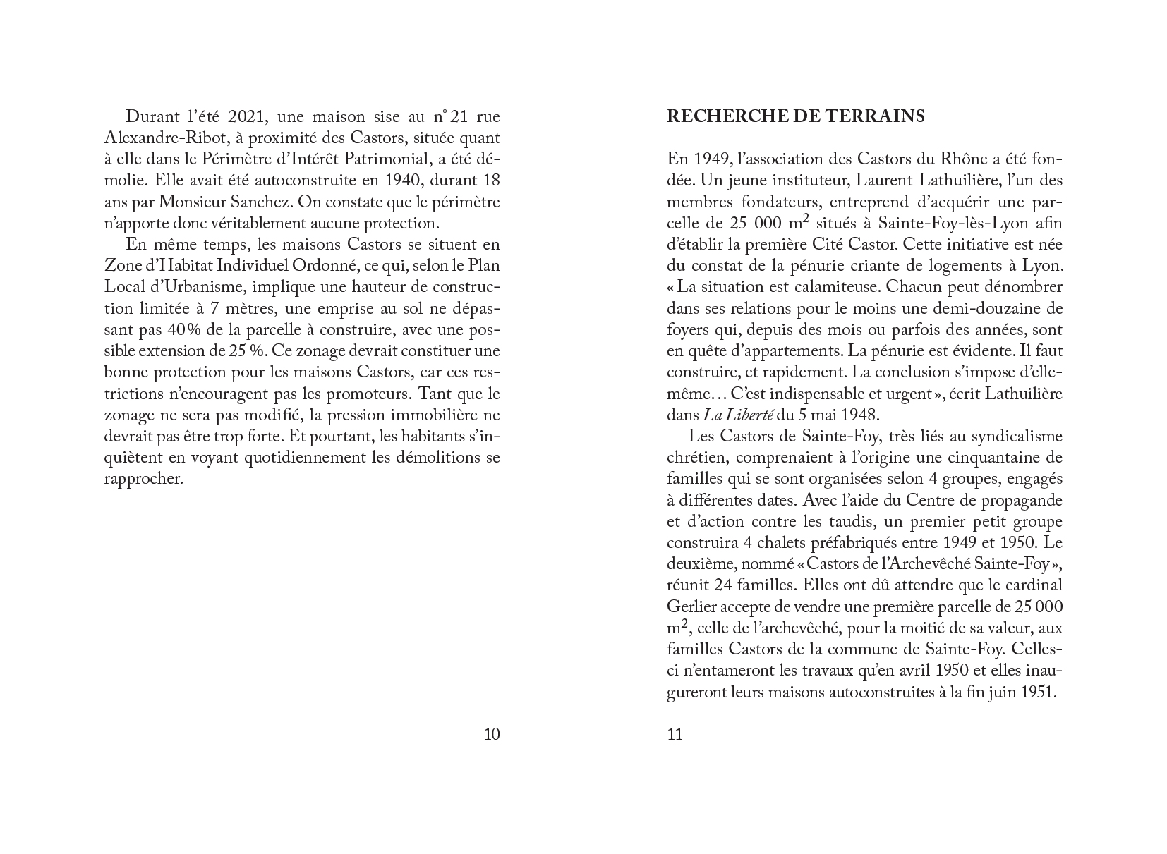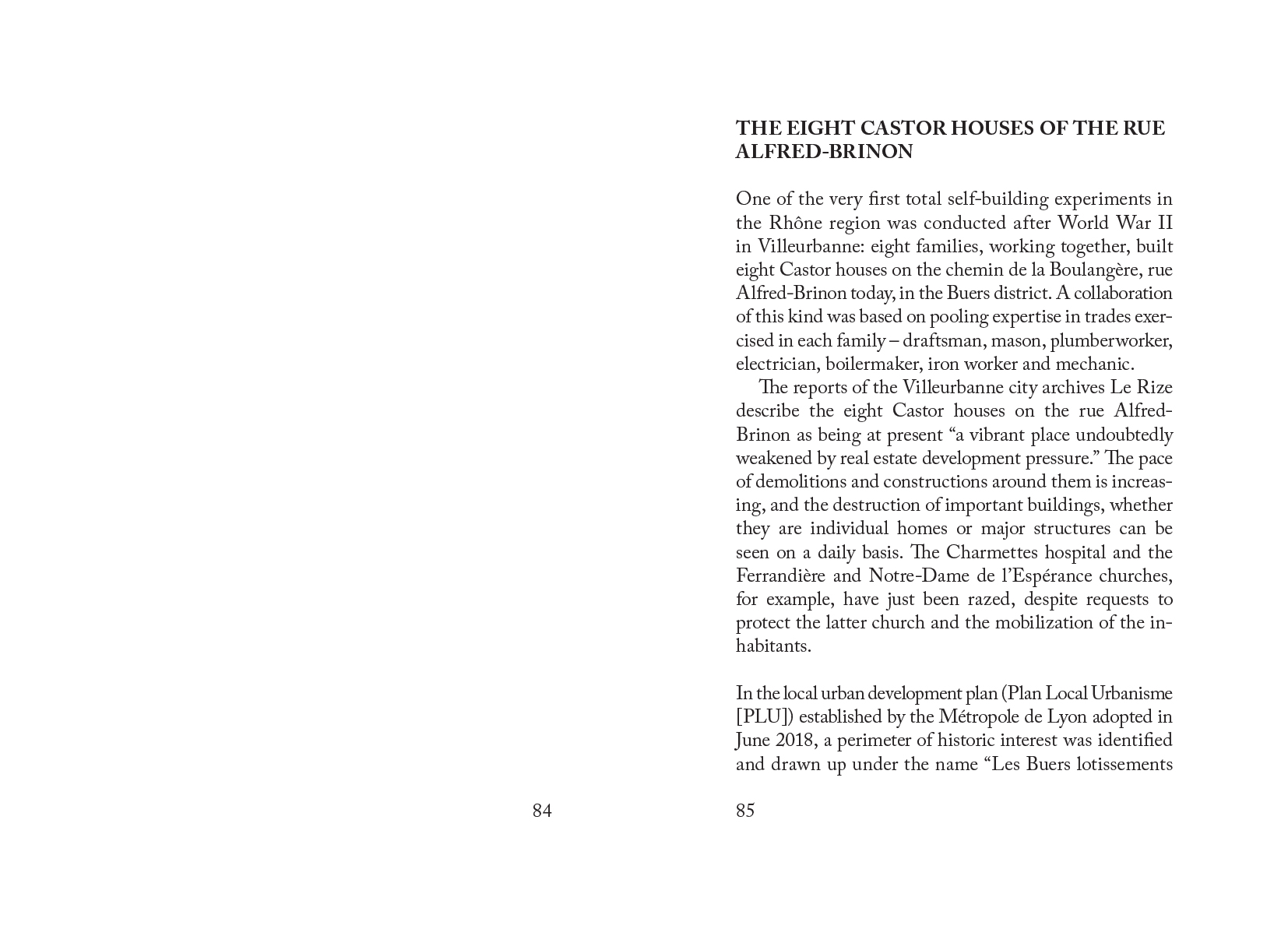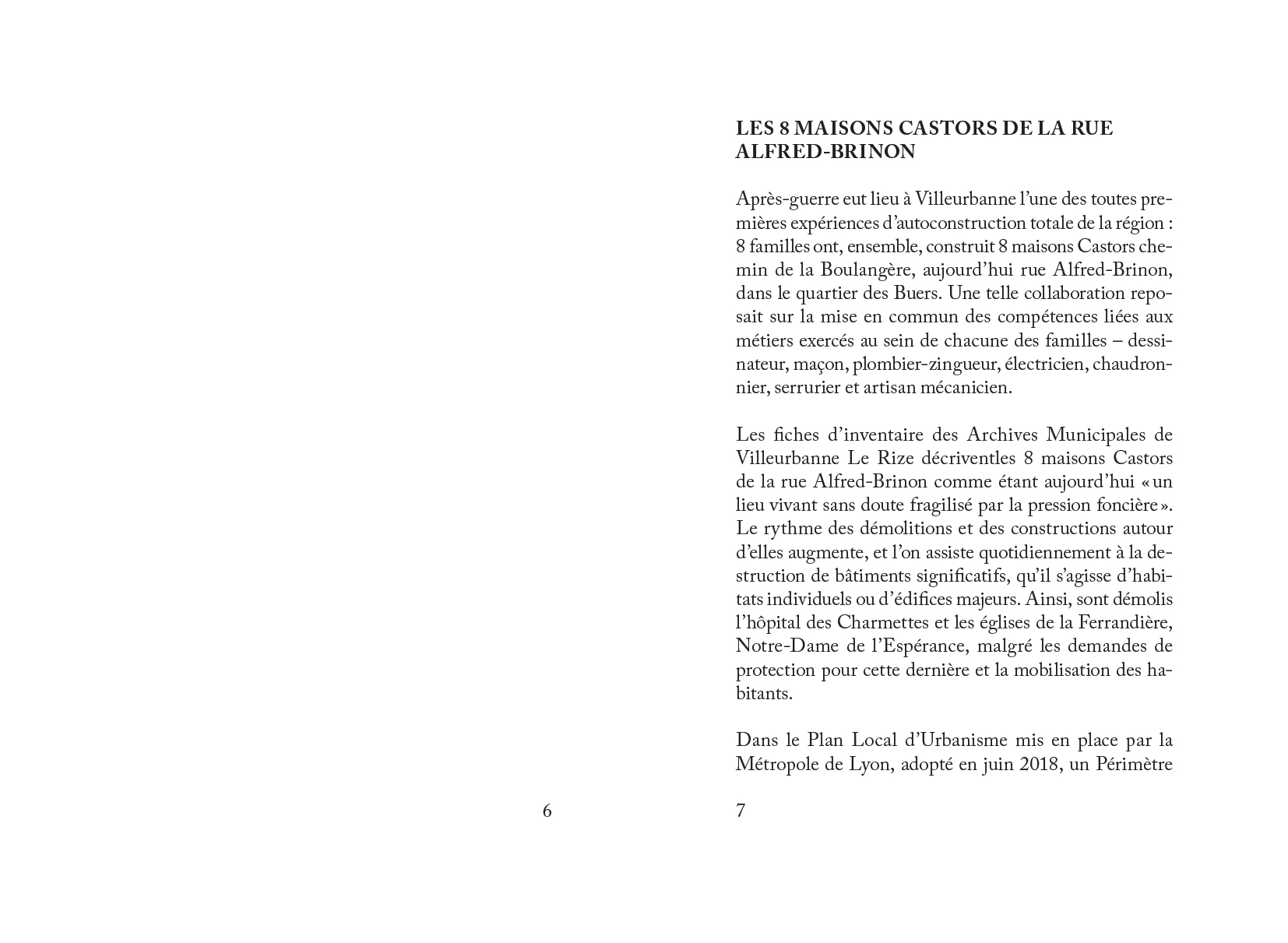 Un travail de recherche de l'artiste Lara Almarcegui sur l'ensemble d'habitats des Maisons Castors à Villeurbanne, issu d'un mouvement d'autoconstruction collaborative des années 1940, via lequel des groupes de familles bâtissaient leurs logements en mettant en commun leurs compétences, qui rappelle que chaque bâtiment est porteur de l'histoire d'un lieu et que sa conservation ou non dans le temps est un indicateur de volontés politiques comme de réalités sociales.