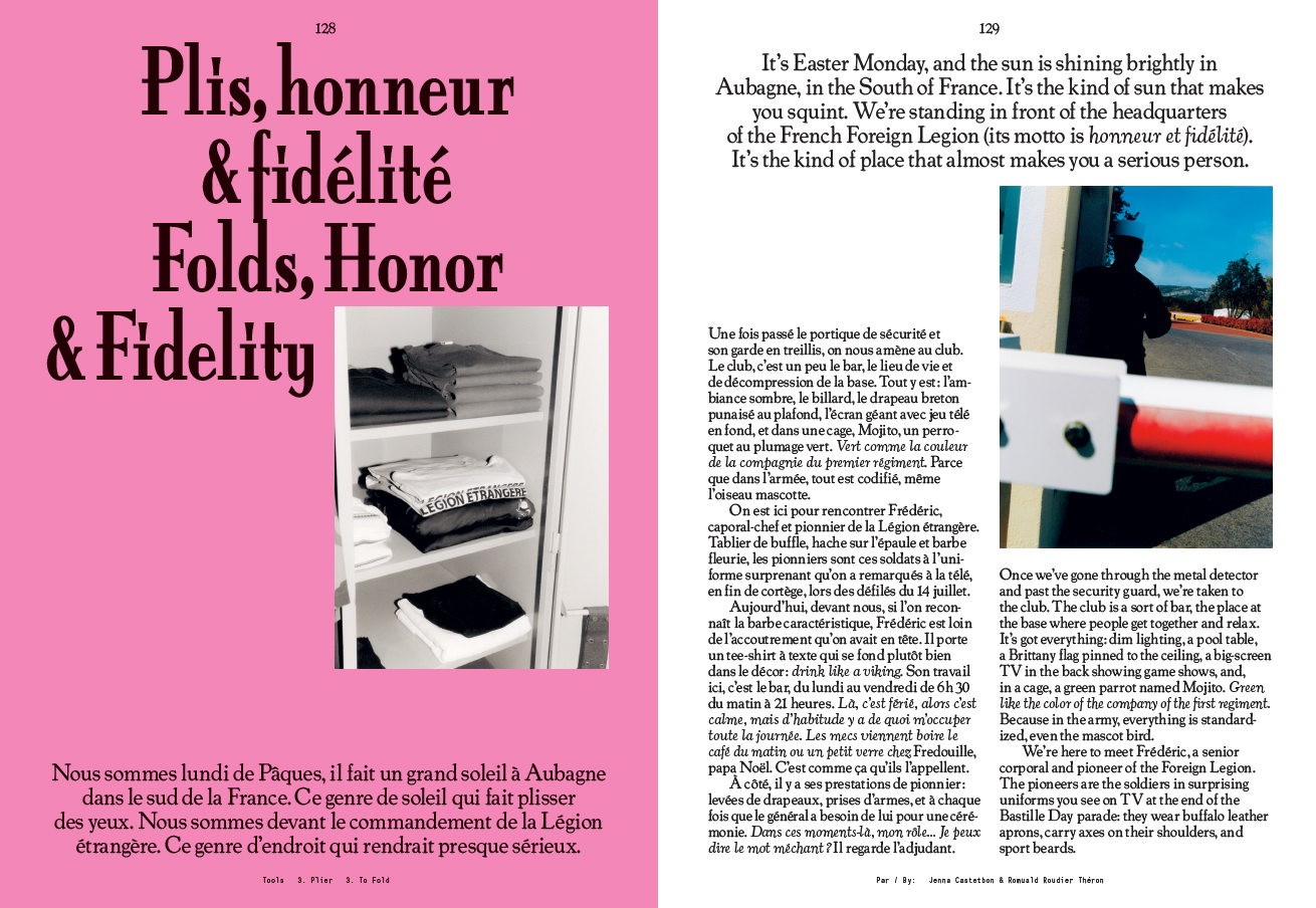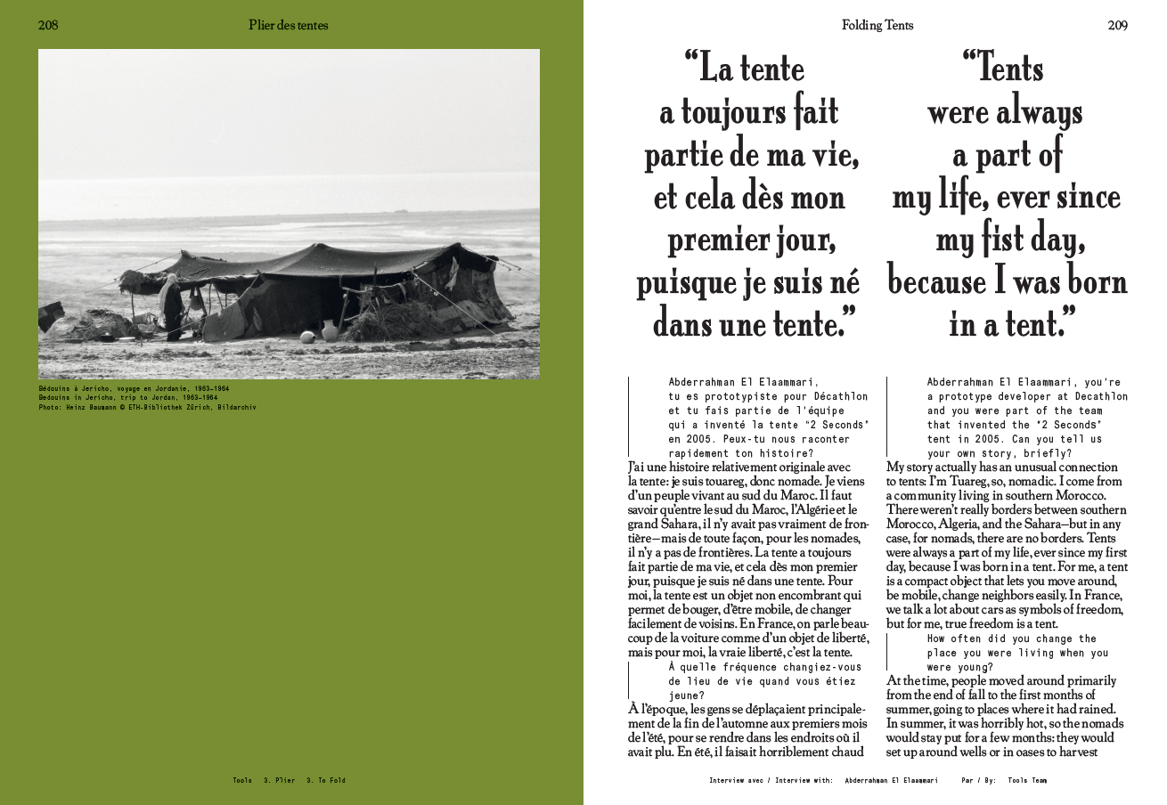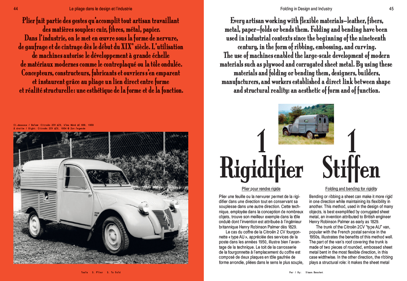 Au fur et à mesure de la construction de ce numéro 3, on s'est donc rendu compte que plier, parfois veut dire cadrer : prendre le pli, rentrer dans le cadre… On dit bien « se plier aux règles ». C'est peut-être le numéro de Tools où le lecteur ou la lectrice rencontrera le plus de militaires ! En effet, l'invention de nouveaux matériaux pliés, cintrés ou ondulés ont parfois appuyé des logiques de camps temporaires, d'infrastructures d'urgences.