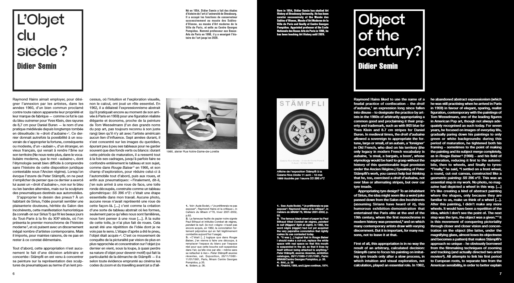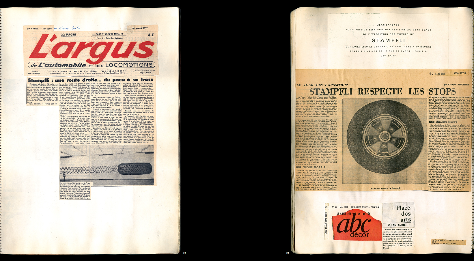Raymond Hains aimait employer, pour désigner l'annexion par les artistes, dans les années 1960, d'un bien commun proclamé contre toute raison apparente leur propriété et leur marque de fabrique, le nom d'une pratique médiévale depuis longtemps tombée en désuétude : le "droit d'aubaine". [...] Cette appropriation n'est aucunement le fait d'une décision arbitraire et concertée : Stämpfli en est venu à concentrer sa peinture sur la représentation des sculptures de pneumatiques au terme d'un lent processus, où l'intuition, et l'exploration visuelle, non le calcul, ont joué un rôle essentiel. En 1962, il a délaissé l'expressionnisme abstrait (qu'il pratiquait encore au moment de son arrivée à Paris en 1959) pour une figuration réaliste élégante et économe, proche de la peinture de