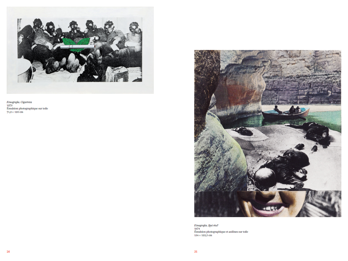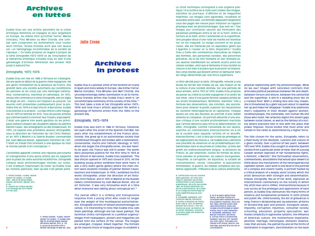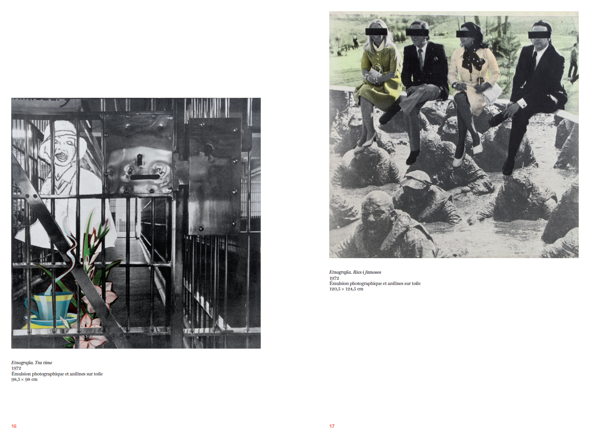 « Eulàlia Grau est née en 1946 à Terrassa en Catalogne, dix ans après le début de la guerre civile espagnole, dix ans après l'installation de la dictature de Franco. Elle grandit dans une société autoritaire qui conditionne les pensées et les corps par une idéologie nationaliste, conservatrice, machiste et catholique. En 1972, lorsqu'elle commence la série Etnografia, elle est âgée de vingt-six ans – Franco est toujours au pouvoir. L'ensemble apparaît comme une réponse percutante et transgressive d'une jeune artiste qui ne supporte plus le poids de cette autorité multiforme. Etnografia compte seize photomontages montés sur toiles. Eulàlia Grau les nomme peintures, bien qu'elle n'ait jamais peint. Le choix technique correspond à une urgence politique. À la surface de la toile sont collées des images, extraites de journaux, d'affiches et de magazines imprimés. Les images sont agrandies, recadrées et associées entre elles. Les formats dépassent largement ceux des pages des revues pour instaurer un rapport physique avec les photomontages. […] Eulàlia Grau y traite des connivences masculines au mépris des femmes, des personnes racisées, des personnes précaires, de la vie non humaine et des résistant.es. Les œuvres manifestent les violents écarts entre les classes sociales, ainsi que le fantasme d'une société où chacun.e est bien à la place que le pouvoir lui impose.