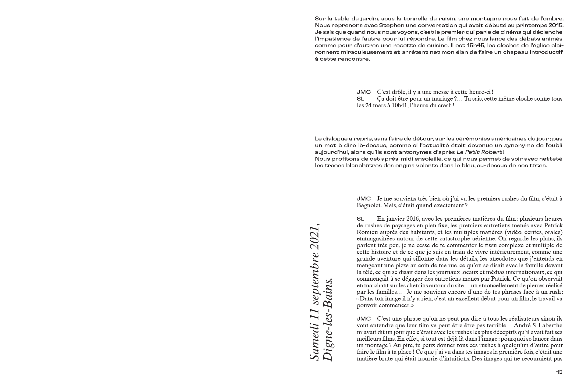 « Il y a 7 ans, un Airbus [...] low-coast a survolé ma maison et a percuté à pleine vitesse la montagne. Il emportera 150 passagers, sans aucun bruit. L'un d'eux s'en dégagera comme celui qui a volontairement percuté l'avion, un co-pilote avec un passé dépressif grave. Nous aurions pu nous replier dans la colline en attendant que le temps passe, mais Patrick et moi avons pendant 6 ans enquêté autour du site de ce crash et des mutations qui ont impacté par la suite, physiquement et imaginairement, ses habitants, transformations dont nous ne nous sommes jamais extraits. Les échos de la mort sont arrivés jusqu'à nos oreilles. Les peurs et les angoisses communes n'ont pas pris le dessus. Nous les avons ensemble transfigurées par nos centaines d'heures de discussions, de réflexion, de confidences, de rêveries, indispensables dans cette histoire marquée au fer rouge par la mort.