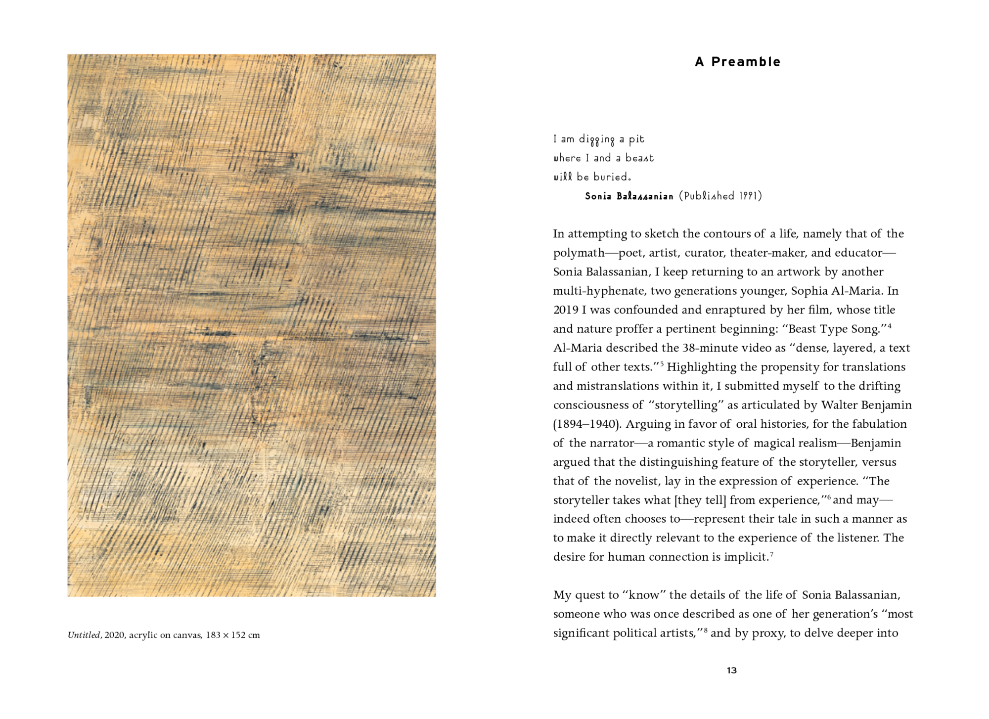 La première monographie complète sur l'art et la vie de l'artiste irano-américaine d'origine arménienne Sonia Balassanian : dans ce portrait très personnel, l'auteur, Omar Kholeif, tisse des liens entre la poésie, les souvenirs et les anecdotes historiques pour tracer les contours de l'univers de Balassanian.